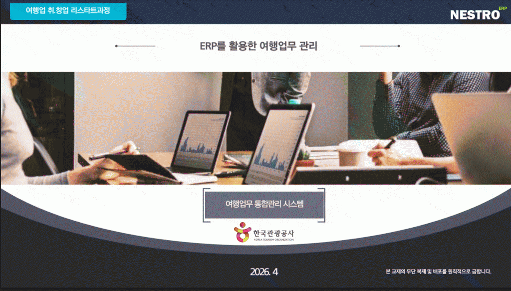 20 4월 여행업 취.창업 리스타트과정 ERP활용 진행 by nestro in ALL, 공지사항Comments 한국관광공사 & 서울중구 ( 수행사 KMA 한국능률협회 ) 여행업 취.창업 리스타트과정 여행사ERP 활용&실습 진행 ( 2026년 4월15일~20일, 네스트로이알피 교재 & 강의 ) Tags: 네스트로이알피,여행사 정보관리시스템 (ERP) 오버뷰,여행사ERP,여행업무관리,여행업취창업리스타트과정